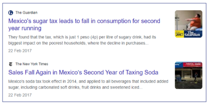 2014年,政府宣布对所有工业化含糖饮料征收10%的统一税,以使其更加昂贵以抑制消费。几乎没有发生任何重新配方:所有软饮料都有相同的价格上涨,这在很大程度上传递给了消费者。