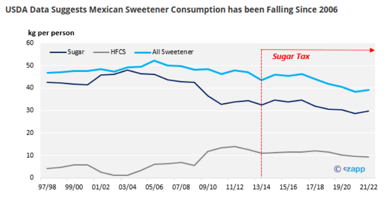 有趣的是,美国农业部(USDA)认为,墨西哥甜味剂的消费量可能正在下降。他们估计人均糖消费量在2004年达到峰值,每人约48公斤。然而,其中一些糖正在被高果糖玉米糖浆 (HFCS) 所取代;糖和HFCS的消费量在2006年达到顶峰,为每人52公斤[8]。