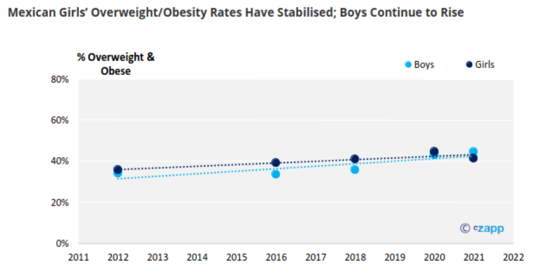 该数据显示,虽然超重儿童的比例在过去13年中一直保持稳定,约为28%,但儿童肥胖症增加了一倍多。这一趋势似乎没有受到糖税或糖标签法规的影响。