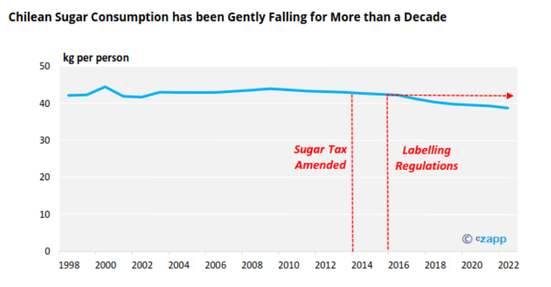 研究很难证明这些规定对饮料销售有任何影响,除非他们采取反事实的方法。其中一份报告显示,苏打水销量与事实相反的[11]相比下降了24%,这听起来令人印象深刻。然而,这相当于每人每天少喝23毫升,只占9卡路里。另一项研究指出,“在任何(软饮料)类别中,辨别明显的税前和税后模式都同样困难……”[12]。用更直白的语言来说,记录在案的碳酸饮料消费量没有变化,尽管这篇论文确实声称,与相反的事实相比,软饮料的销量下降了22%。第三项研究发现,“税收实施后,(饮料)价格或购买量没有明显变化……”,并声称高糖苏打水的销量与事实相反的[13]相比只下降了3.4%。总之,三项研究中有两项显示,苏打水的购买或消费量没有绝对减少。三项研究中的两项发现了下降与反事实(无法被科学证伪)。与相反事实相比,降幅最大的结果是每人每天只少摄入9卡路里。有关反事实研究的更多细节,请参见附录。简而言之:理论上,这些规定减少了智利的碳酸饮料消费。实际上,他们并没有。Cz每年会估计智利的食糖消耗量。我们通过对当地食糖产量的预测、扣除出口,增加进口后得出表观消费量。我们认为,糖的消费量在2000年代中后期达到峰值,每人每年约44公斤,此后逐渐下降。