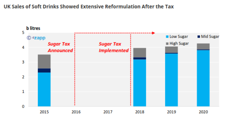 其中包括每100毫升含糖至少5克的软饮料,每升税率为0.18英镑。每100毫升含糖8克或以上的人的税率更高,为每升0.24英镑。乳制品饮料和果汁除外。分级征税引发了无品牌软饮料的大范围调整。一些品牌饮料,如三得利(Ribena, Lucozade)和AG Barr (Irn Bru)也进行了重新配方,每100毫升含糖量低于5克。然而,许多其他品牌软饮料公司保留了高糖苏打水,而是扩大了低糖和无糖产品的供应。税收的成本大部分转嫁给了消费者。考虑到广泛的配方调整,软饮料的含糖量下降也就不足为奇了。英国政府估计,软饮料中的糖销量已从2015年的13.5万吨降至2020年的8.9万吨。然而,在此期间,所有类别的软饮料总销量增长了21.3%。