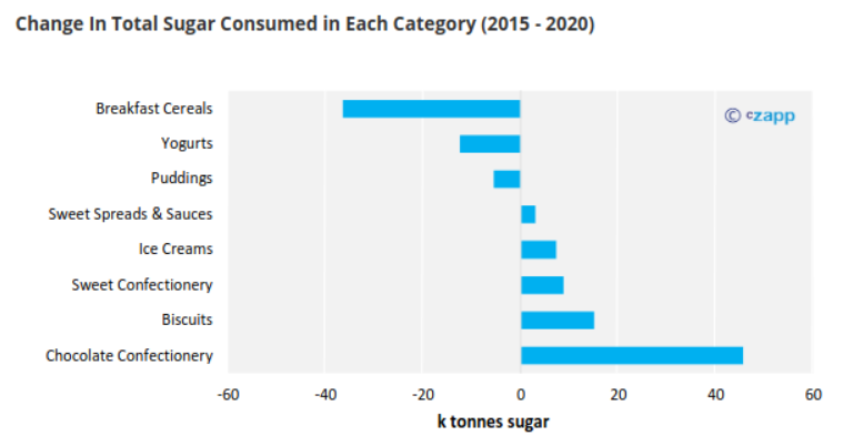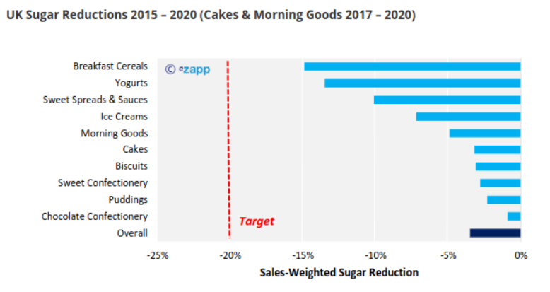 在2015年至2020年期间,英国食品制造商在销售加权基础上仅将所有类别的糖含量降低了3.5%,远低于政府公司20%的目标。最容易重新配制的产品(早餐麦片(-14.9%)和酸奶(-13.5%)的降幅最大。蛋糕、饼干、糖果、布丁和巧克力糖果的含糖量几乎没有减少。