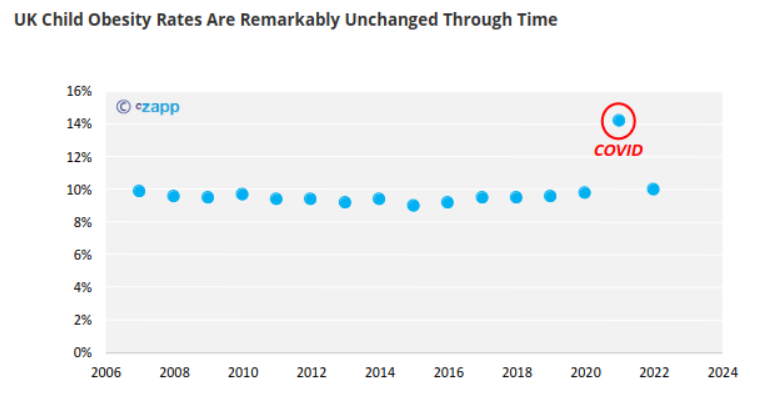 就连英国政府选择的评估绩效的指标——儿童肥胖症,也没有大幅下降[37]。十多年来,除了实施新冠疫情封锁期间,这一比例在十多年里一直顽固地保持在略低于10%的水平。