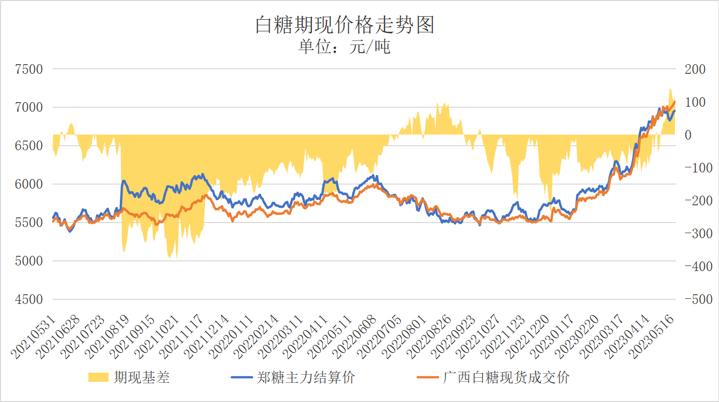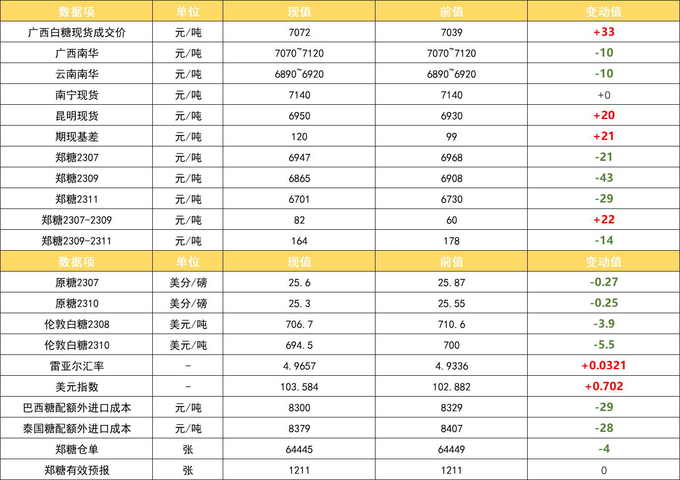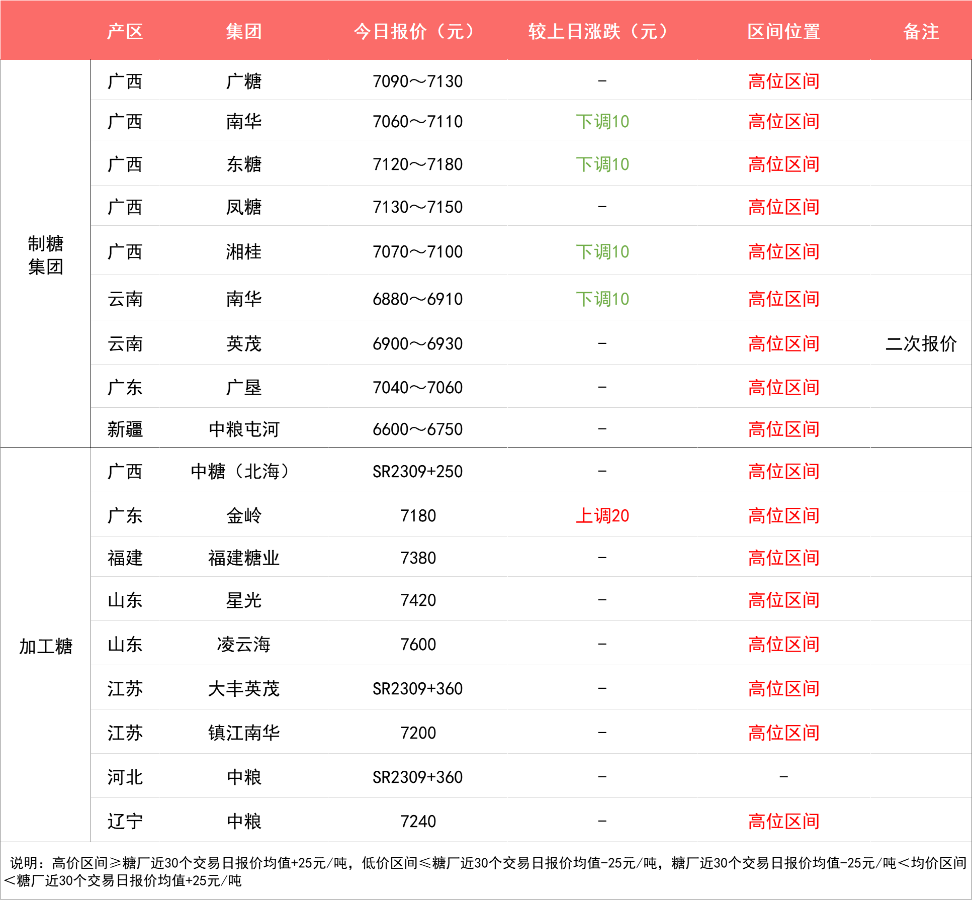 今日广西白糖现货成交价为7072元/吨,上涨33元/吨;产区制糖集团报价区间为6880~7180元/吨,普遍下调10元/吨;加工糖厂报价区间为7180~7600元/吨,报价整体持稳,仅广东金岭上调20元/吨。夏季消费将至,部分低库存的贸易商适时补库,现货交投情况有所回暖,成交略有好转。