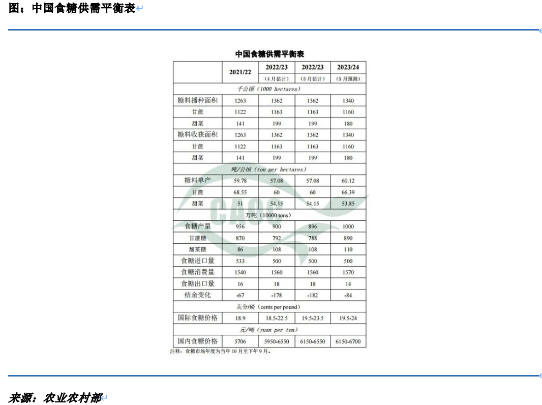 农业农村部更新了产需预估,目前2022/23年度中国食糖生产全部结束,食糖产量小幅调减至896万吨;食糖进口成本持续上涨,国内食糖均价上调至6150-6550元/吨。本月预测,2023/24年度,甘蔗面积保持稳定,甜菜种植面积减少,糖料种植面积持平略减;土壤墒情向好,糖料单产提升,食糖产量预计1000万吨;食糖进口量保持稳定,消费量略增至1570万吨。
