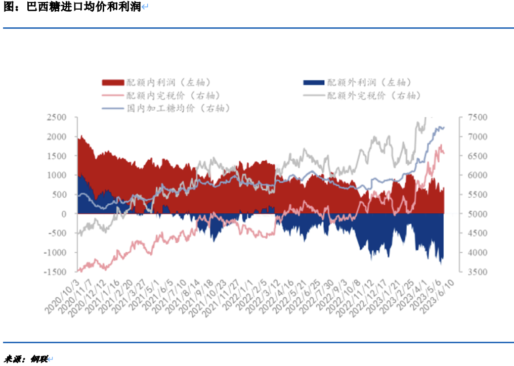 2023年以来原糖持续上涨,内盘虽然也处于上涨通道中,但是涨幅不及原糖,因此50%关税的进口利润持续倒挂,而我国今年减产明显,产需缺口扩大,进口糖无法及时进入,导致现货紧张的趋势延续。