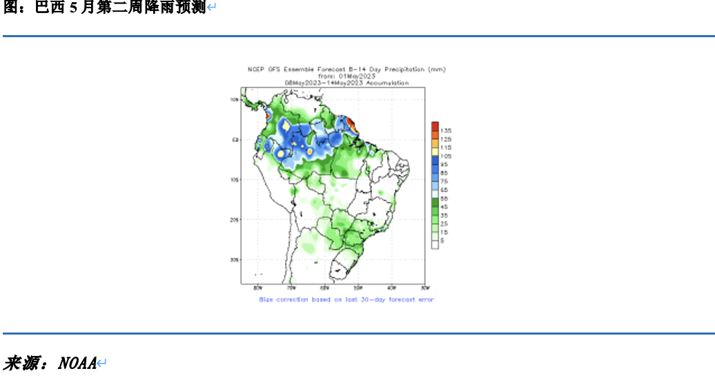 对于5月的情况,第一周的降雨是偏少的,干燥的环境利于巴西糖厂加速开榨,但是根据NOAA,第二周存在一些降雨量,因此需要持续关注接下来的天气情况,在市场对供应端信息本就敏感的当下,生产进度的放缓或导致多头情绪的反复。