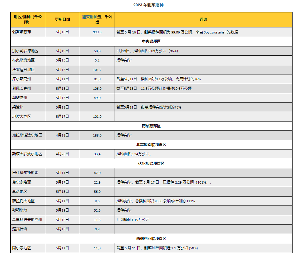俄罗斯:截至2023年5月16日,已种植甜菜99.1万公顷