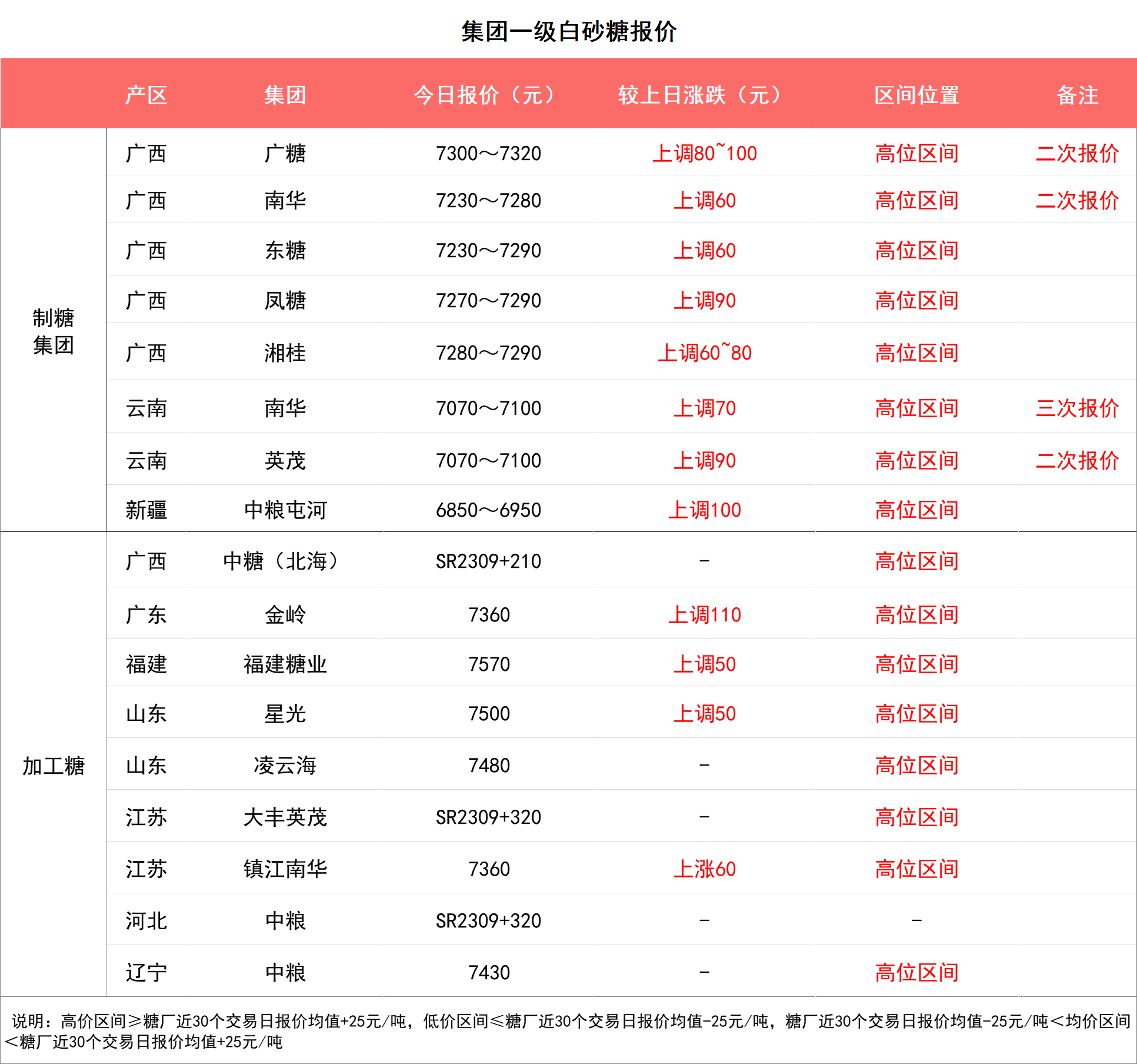 广西制糖集团报价区间为7230~7320元/吨,广西南华二次报价、广西东糖上调60元/吨,广西湘桂上调60~80元/吨,广西凤糖均二次报价上调90元/吨,广西广糖二次报价上调80~100元/吨。