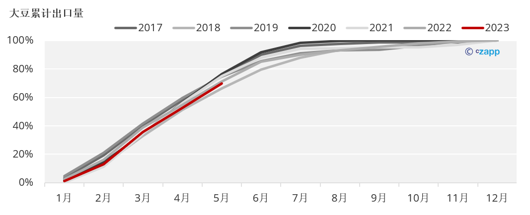 第二个原因是大豆出口量,截至5月份,大豆出口占2023年预期总量的70%,低于正常水平。根据IMEA (马托格罗索农业经济研究所) 的数据,马托格罗索州(占巴西大豆产量的30%)的大豆销售进度为66%,远低于85%的预期水平。由于农民在等待大豆价格上涨,大豆的销售被推迟,这可能会影响到迄今为止的出口量。