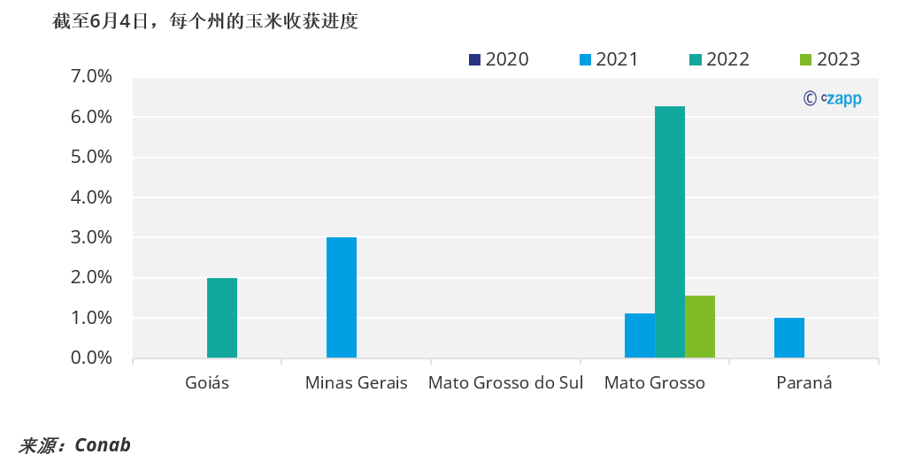 现在巴西开始收获二季玉米,这个名字有点误导人,因为二季玉米其实占主导地位,占玉米总产量的76%以上。我们预计本季将达到创纪录的9600万吨。收获速度有所推迟,到目前为止,主要产区的收获速度为0.7%,而去年同期为3%。