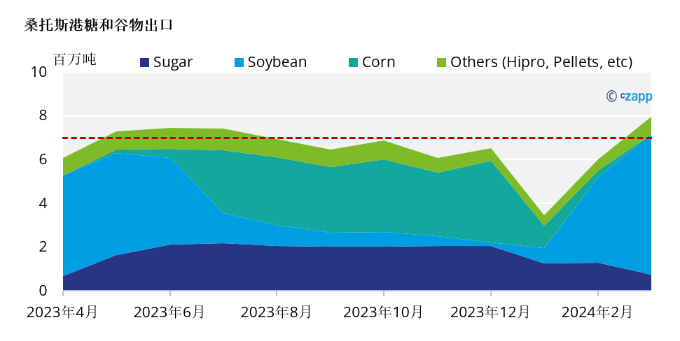 由于巴西40%的玉米产量用于出口,未来几个月将有大约4800万吨玉米运往港口。其中43%是通过桑托斯出口的。