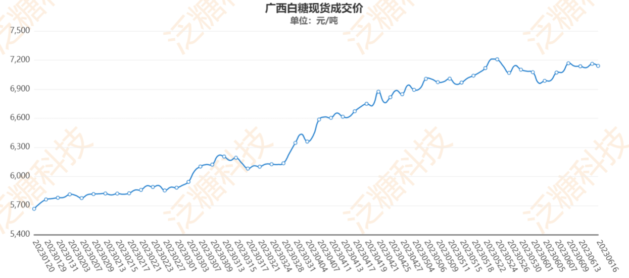 广西白糖现货成交价本周五收于7140元/吨,周环比下跌27元/吨,周度运行区间为7122~7161元/吨,跌幅为0.38%。