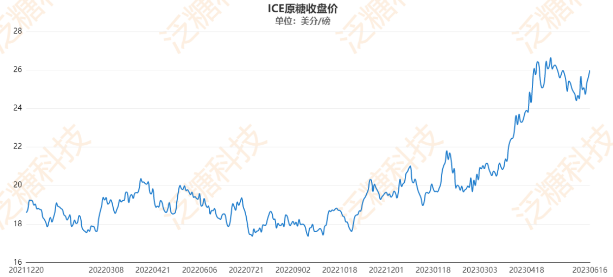 本周国际糖市受基本面和宏观共同主导。周二,巴西中南部5月下半月产糖数据公布,甘蔗入榨量、产糖量分别同比增加5.48%、25.16%,供给逐渐上量,ICE原糖期价承压下行至24.7美分低点;而后随着美国5月议息维持利率上限不变,美元指数下行,宏观方面出现利好,叠加厄尔尼诺备受市场关注,期价连收三连阳至26美分一线。