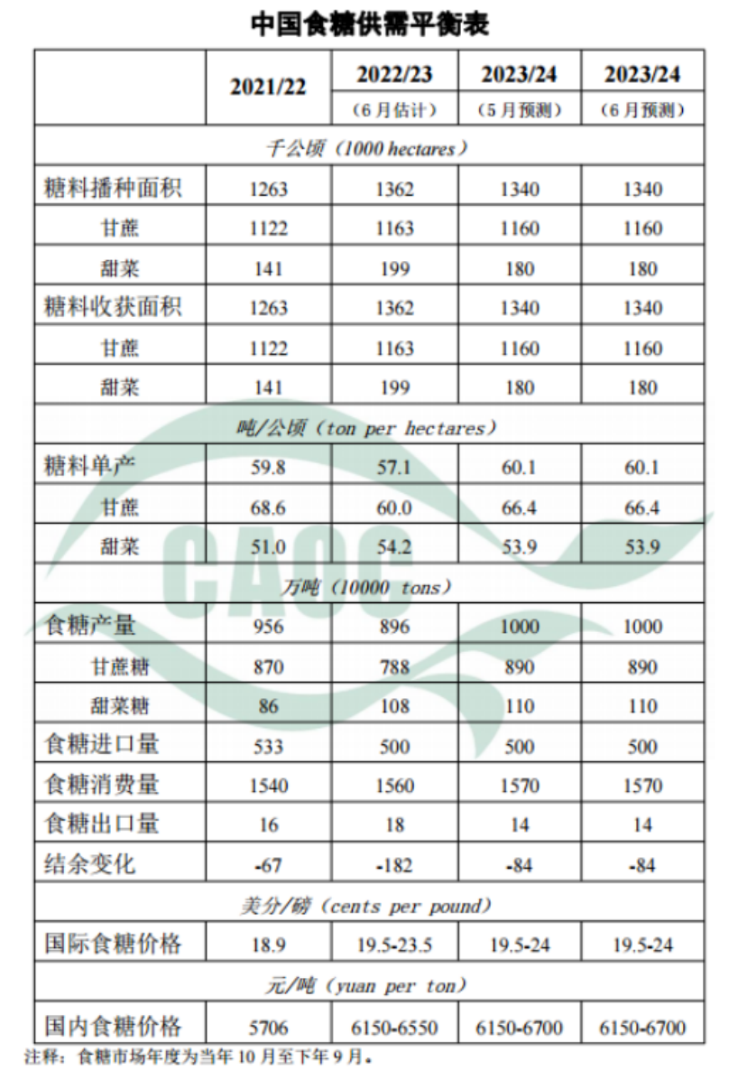 6月对2023/24年度中国食糖供需形势预测与上月保持一致。巴西产糖量及其出口如预期增加,国际糖价有所回落。受国际糖价传导影响,国内糖价略有回调,但夏季是传统食糖消费旺季,且工业库存偏低,糖价调整空间有限,后期国际油价波动、异常天气等变数犹存,国内外市场仍有较大不确定性。广西、云南产区5月降水偏少,近期降雨偏多利于旱情缓解。