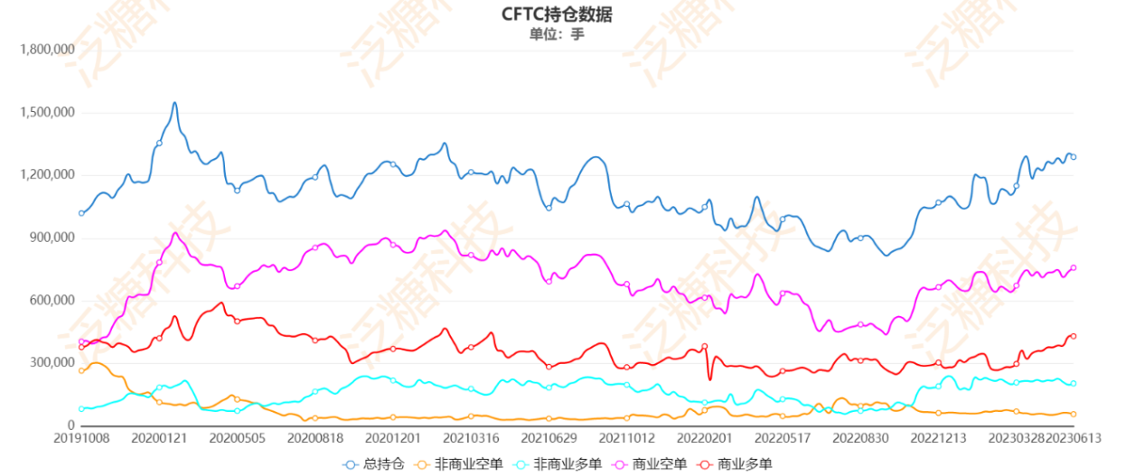 截至6月13日当周,ICE原糖期货+期权总持仓为1289492手,较前一周减少16282手。投机多头持仓300861手,较前一周增加5463手;投机空头持仓107462手,较前一周减少9284手;投机净多持仓为193399手,较前一周增加14747手。