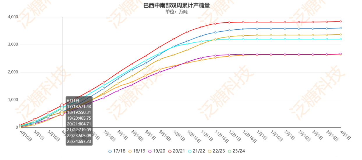 巴西中南部:2023/24榨季截至5月下半月,累计入榨量为12537.9万吨,同比增加1799.5万吨,增幅达16.76%;甘蔗ATR为124.49kg/吨,同比增加2.32 kg/吨;累计制糖比为46.88%,同比增加6.38%;累计产乙醇57.66亿升,同比增加5.77亿升,增幅达11.12%;累计产糖量为697.2万吨,同比增加190.9万吨,增幅达37.70%。
