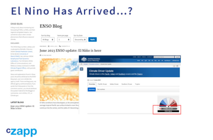 美国人通过观察海洋表面温度和热带太平洋大气来确定厄尔尼诺现象是否正在发生。他们认为我们将会有厄尔尼诺现象。澳大利亚着眼于信风、南方涛动指数、天气模型和海面温度。根据他们的方法,我们处于厄尔尼诺预警状态,但他们还没有宣布厄尔尼诺。