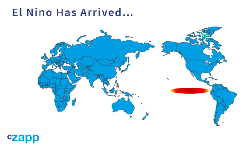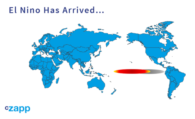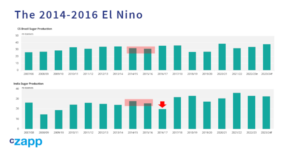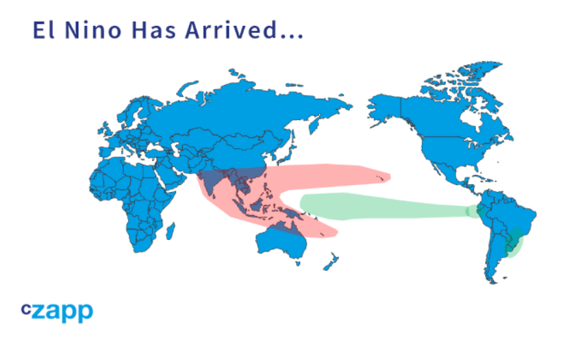 总的来说,厄尔尼诺现象会导致西太平洋的降雨量减少,因为温暖的海水从那里扩散到东太平洋,并带走了雨水。这可能意味着印度、泰国、印度尼西亚、菲律宾和澳大利亚北部的干旱,这些都是主要的甘蔗种植区。这是未来几个月需要注意的事情,尤其是北半球甘蔗种植区。