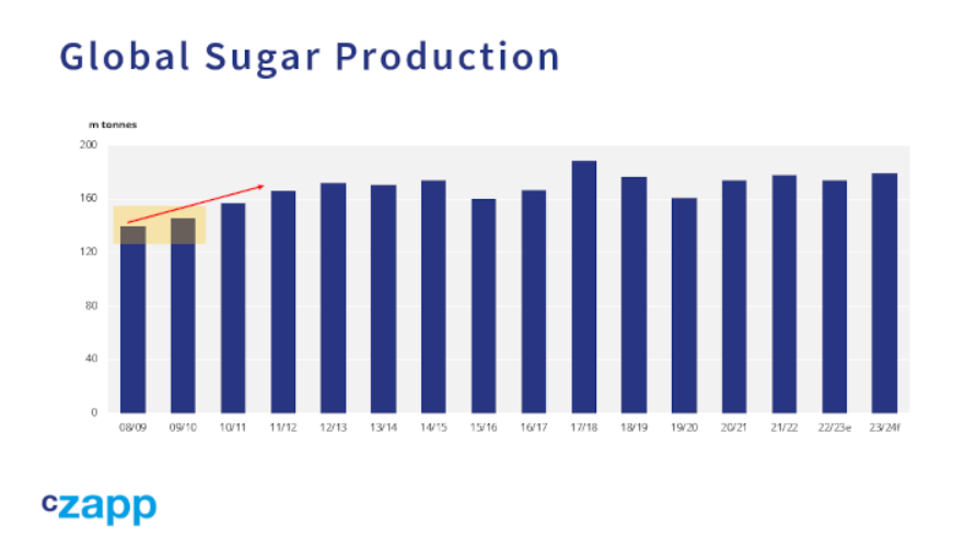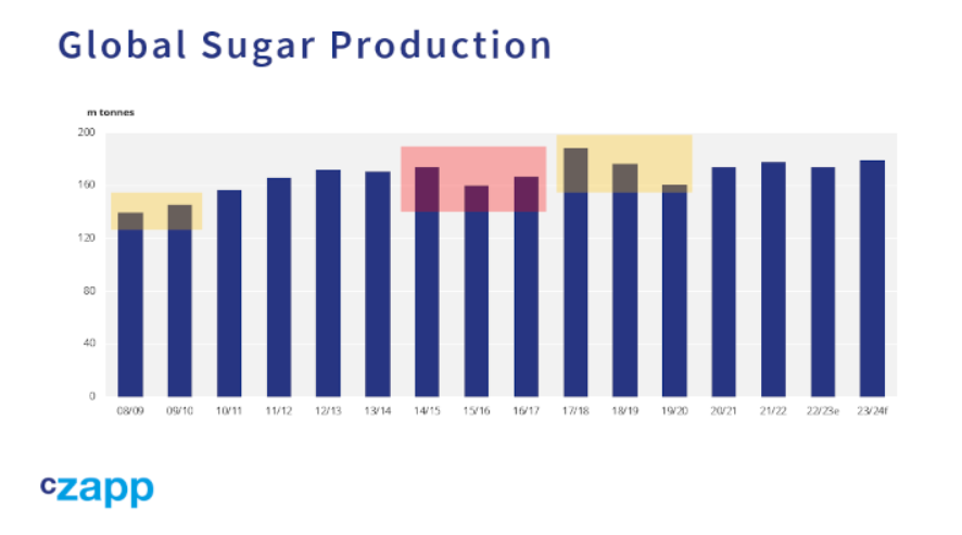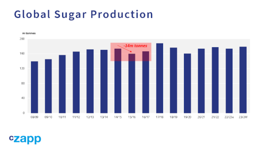 当时,全球食糖产量正从此前的低点强劲增长,这是由印度的波动周期造成的。印度的波动周期导致农民种植过多的甘蔗以应对高价格,而他们种植的大量作物无法按时获得报酬,然后他们会改种其他作物。