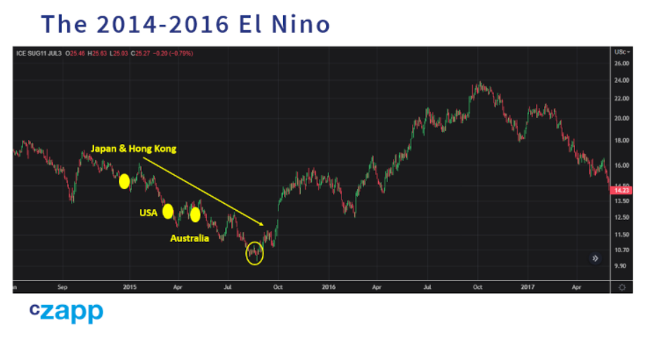 2014年底,日本和中国香港率先宣布出现厄尔尼诺现象。2015年3月,美国紧随其后,2015年5月,澳大利亚紧随其后。在这段时间里,原糖的价格仍在从2011年36美分的高点下跌,直到8月份才跌至10美分的低点。大约在这个时候,很明显厄尔尼诺现象将在年底前加剧为强现象。