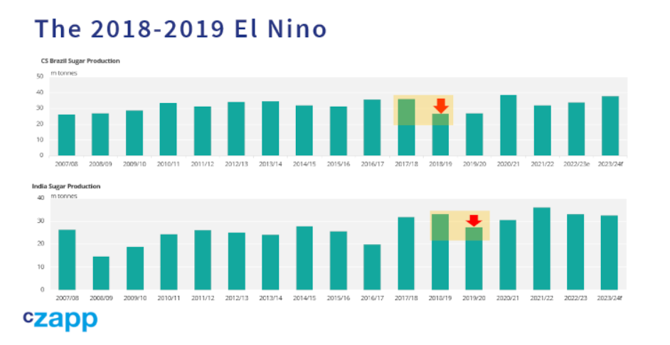 在我的糖业生涯中,有三次厄尔尼诺,2014年至2016年发生了一次强事件,2009/10年和2018/19年发生了一次较小的事件。