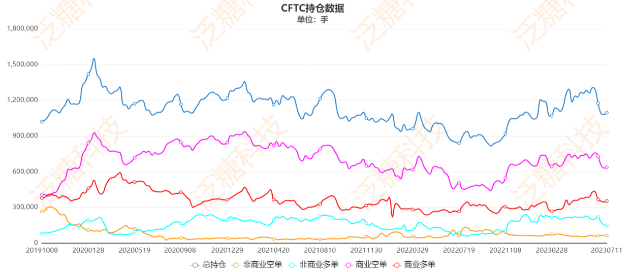 截至7月11日当周,ICE原糖期货+期权总持仓为1096076手,较前一周增加15069手。投机多头持仓229815手,较前一周减少1447手;投机空头持仓115207手,较前一周增加4033手;投机净多持仓为114608手,较前一周减少5480手。