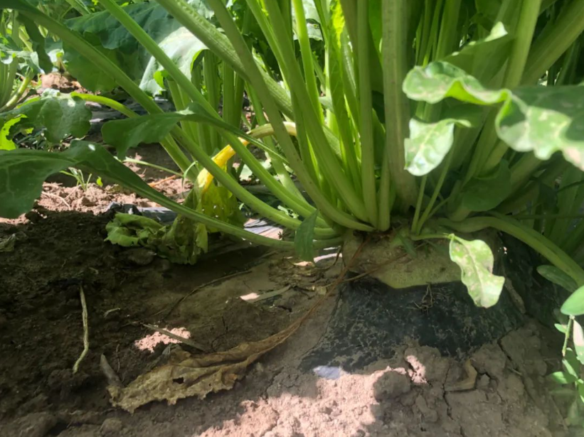 甜菜根已经初步长成,很多从地面上裸露出来,拨开甜菜叶可以看得清清楚楚。