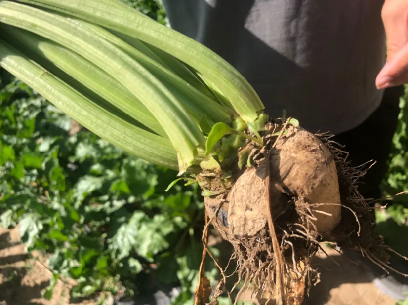 黄立刚怕我们看得不够真切,挑了一棵小的拔出来让我们跟甜菜根来了个“亲密接触”。大家端详、拍了张照片后,生怕影响了这棵甜菜的生长,赶紧让黄立刚再把它埋进土里。