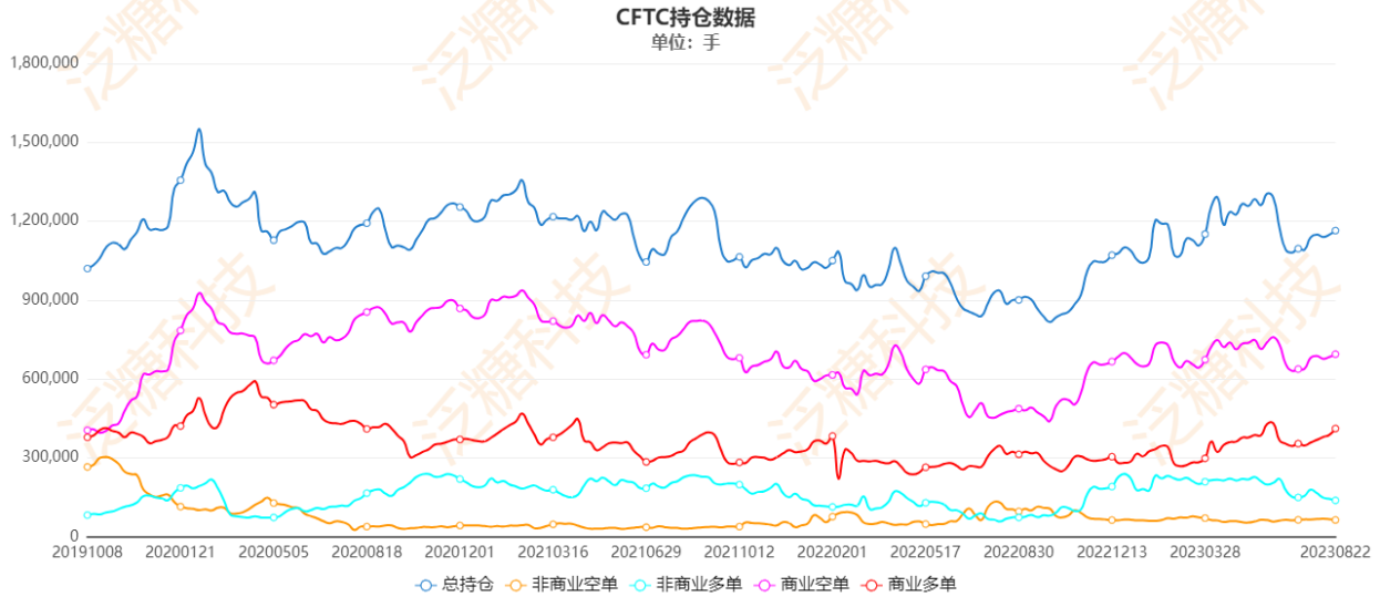 截至8月22日当周,ICE原糖期货+期权总持仓为1164731手,较前一周增加15661手。投机多头持仓222218手,较前一周减少11253手;投机空头持仓116911手,较前一周减少2342手;投机净多持仓为105307手,较前一减少8911手。