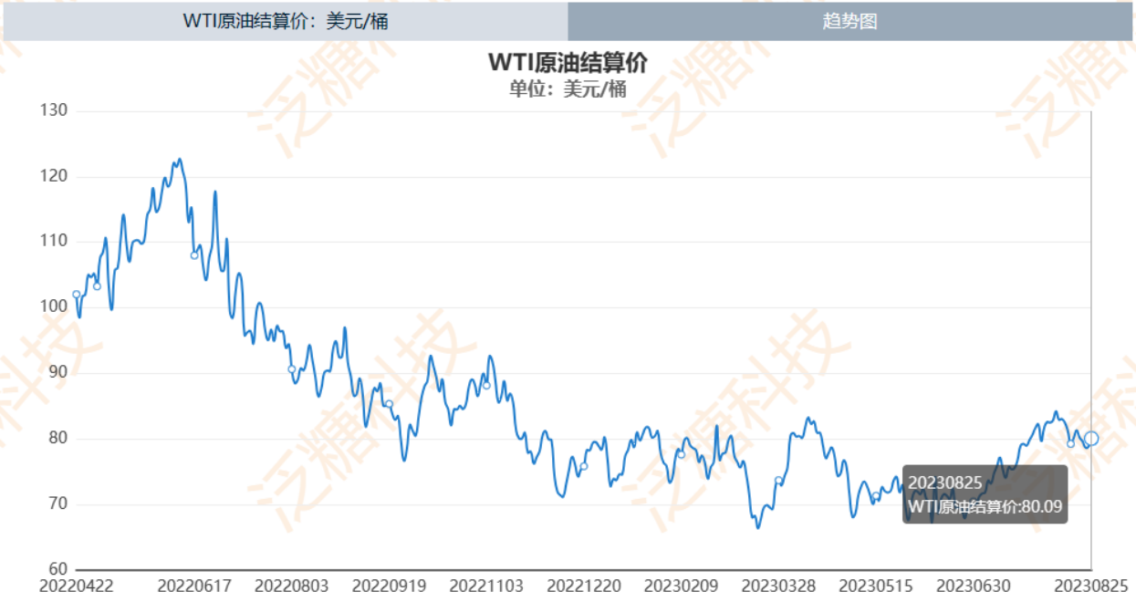 WTI原油本周运行区间为77.62~81.75美元/桶,收于80.09美元/桶,较上周下跌1.73美元/桶,周涨跌为-1.54%,振幅为5.08%。