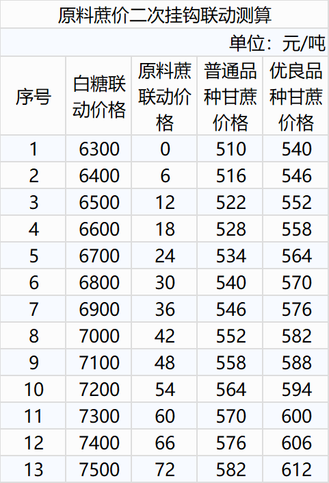 二、 糖料蔗收购价格二次结算时间为2024年10月,白砂糖结算价格采用广西糖业协会统计的2023/2024年榨季截止2024年9月底全区白砂糖累计平均含税销售价,按联动关系进行二次结算。