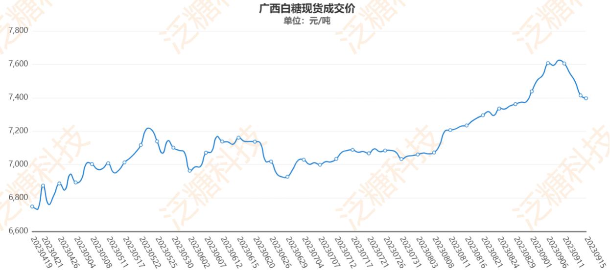广西白糖现货成交价本周五收于7397元/吨,周环比下跌228元/吨,周度运行区间为7397~7605元/吨,跌幅为2.99%。