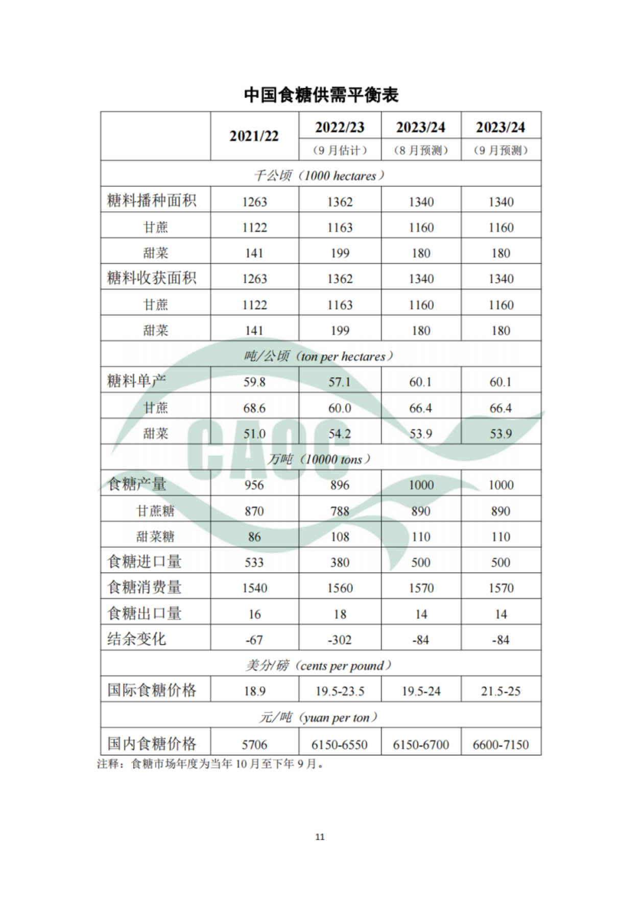 本月对2023/24年度国内食糖生产和消费预测数据不作调整。当前,广西甘蔗整体长势良好,预计后期温度接近常年,降雨量偏多,但甘蔗黑穗病、甘蔗螟虫等病虫发生较为明显,后期需密切关注天气和病虫害影响;甜菜长势总体良好,新年度甜菜糖生产或将在9月中下旬开启。国际方面,巴西食糖产量和出口持续增长,但难以填补因印度和泰国食糖产量和出口下降带来的缺口,国际糖业组织(ISO)预测2023/24年度全球食糖产需缺口为212万吨,供需关系偏紧,本月将国际糖价预测区间下限每磅提高2美分,上限每磅提高1美分,考虑到国际价格传导影响,将国内糖价预测区间每吨上调450元。后期需关注巴西甘蔗压榨进度及物流情况、北半球甘蔗主产国的天气情况和食糖出口政策变化。