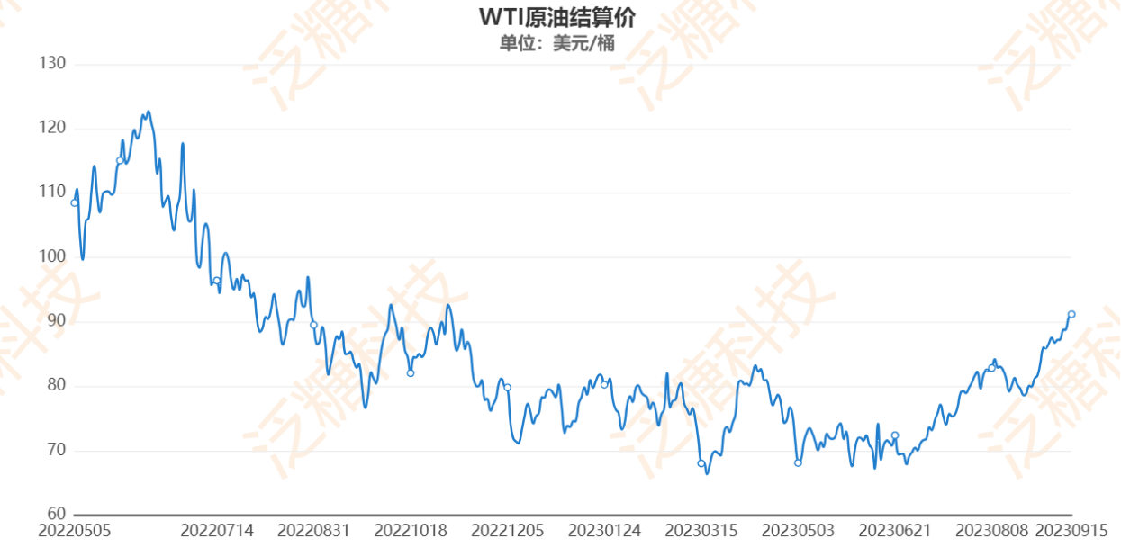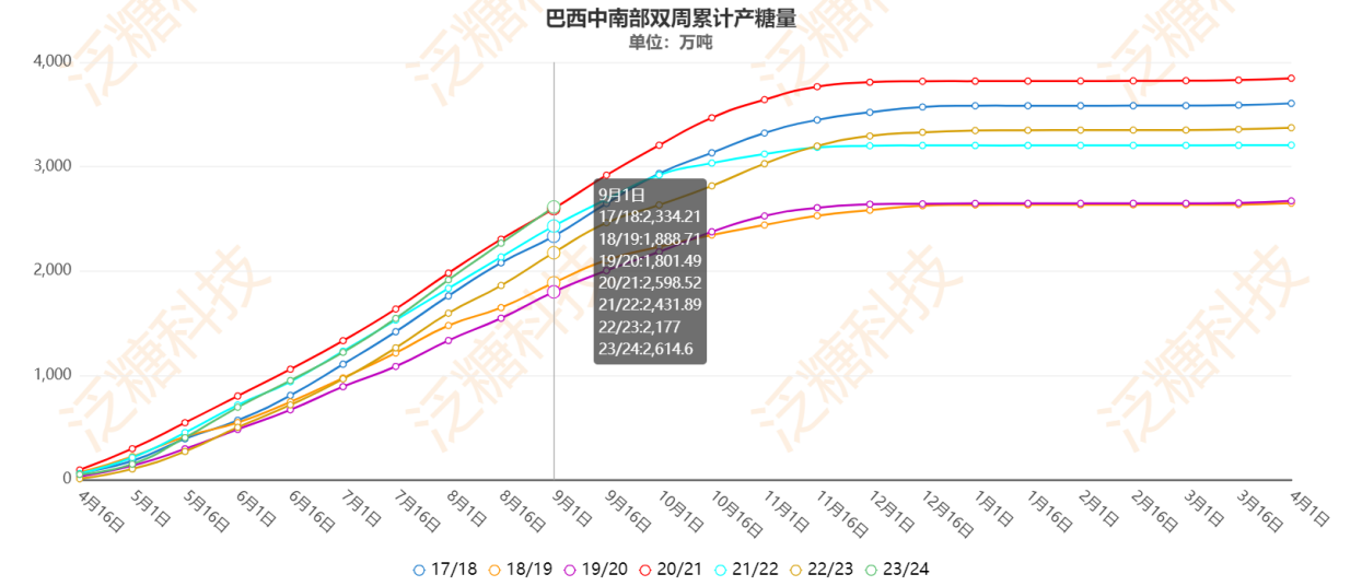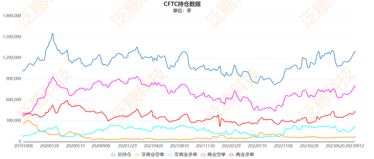 数据来源:农业农村部 (二)期现基差及仓单 本周五仓单数量为27045张,周环比减少2511张;有效预报235张,周环比减少305张;仓单+有效预报数量27280张,较去年同期增加7870张,同比增幅达28.85%。 本周期现基差范围为492~597元/吨,呈高位运行态势。 (三)配额外加工完税成本维持高位 截至周五,巴西配额内加工完税成本为6820元/吨、配额外加工完税成本为8775元/吨,环比上周分别上涨119元/吨、157元/吨;泰国加工完税成本为6823元/吨,配额外加工完税成本为8778元/吨,环比上周分别上涨48元/吨、63元/吨。相较国内沿海加工糖厂报价7600~8020元/吨,巴西配额外进口利润约为-1175~-760元/吨。 (四)WTI原油价格 欧佩克及其减产同盟国继续限制供应量、全球主要央行近期均释放出有利信号,微观宏观助推油价上行。 WTI原油本周五收于91.21美元/桶,较上周五上涨3.98美元/桶,周度运行区间为86.77~91.22美元/桶,周涨幅为4.56%,总体呈单边上行态势。 数据来源:同花顺期货通、泛糖科技 (五)原糖CFTC持仓 截至9月12日当周,ICE原糖期货+期权总持仓为1287476手,较前一周增加36344手。投机多头持仓309003手,较前一周增加7281手;投机空头持仓116738手,较前一周增加2710手;投机净多持仓为192265手,较前一周增加4571手。 数据来源:洲际交易所、泛糖科技 (六)食糖生产及贸易流 巴西中南部:2023/24榨季截至8月下半月,累计入榨量为40664.5万吨,同比增加3995.5万吨,增幅达10.90%;甘蔗ATR为137.24kg/吨,同比下降0.79 kg/吨;累计制糖比为49.17%,同比增加4.01%;累计产乙醇190.97亿升,同比增加11.26亿升,增幅达6.26%;累计产糖量为2614.6万吨,同比增加436.4万吨,增幅达20.03%。 数据来源:UNCIA、泛糖科技 Williams:截至9月13日当周,巴西港口等待装运食糖的船只数量为102艘,此前一周为97艘;港口等待装运的食糖数量为444.76万吨,此前一周为448.59万吨,其中高等级原糖(VHP)数量为430.48万吨。 桑托斯港等待出口的食糖数量为351.41万吨,帕拉纳瓜港等待出口的食糖数量为81.62万吨。
