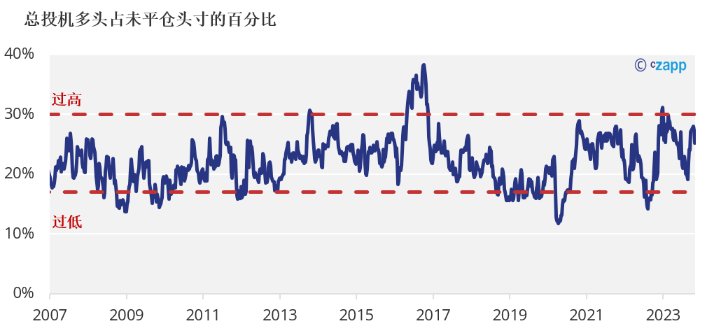 目前总投机多头占未平仓头寸的百分比为25%,这是正常水平。按照目前的未平仓合约,投机资金可以在它们的总多头头寸上再增加5万手,这也不会达到过高的水平。