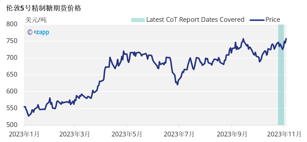 5号精制糖期货的即将到期的2023年12月合约价格近期保持上涨趋势,上周五收于757美元/吨。