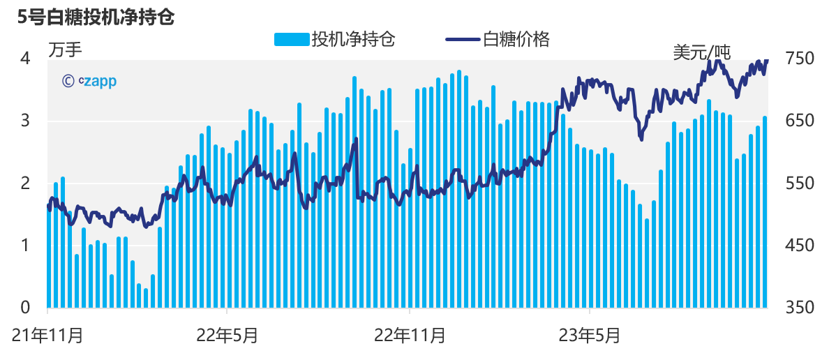 也就是说,精制糖的投机资金选择将它们的多头头寸扩大1537手,使总净投机头寸回升到3.06万手。