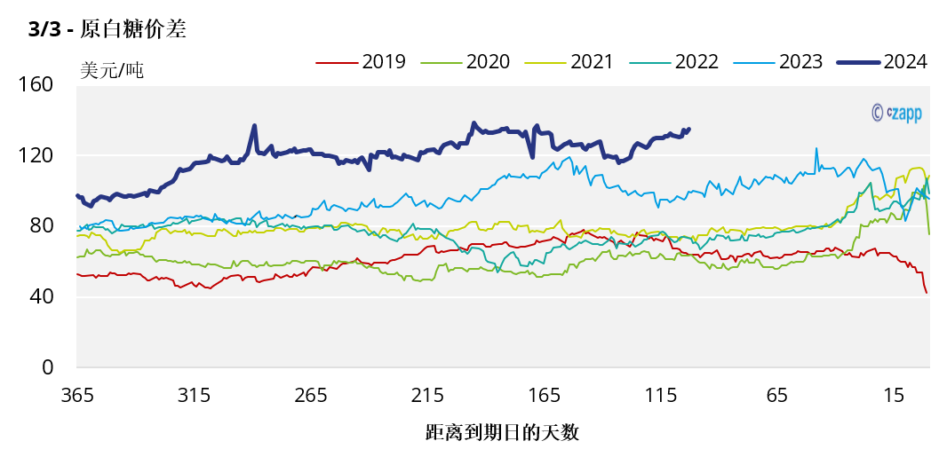 我们预计,2024年的大部分时间里,精制糖市场将出现供应不足的情况,这一点可以从5/5和8/7月原白糖价差中看出,目前这两个原白糖价差均逼近145美元/吨。