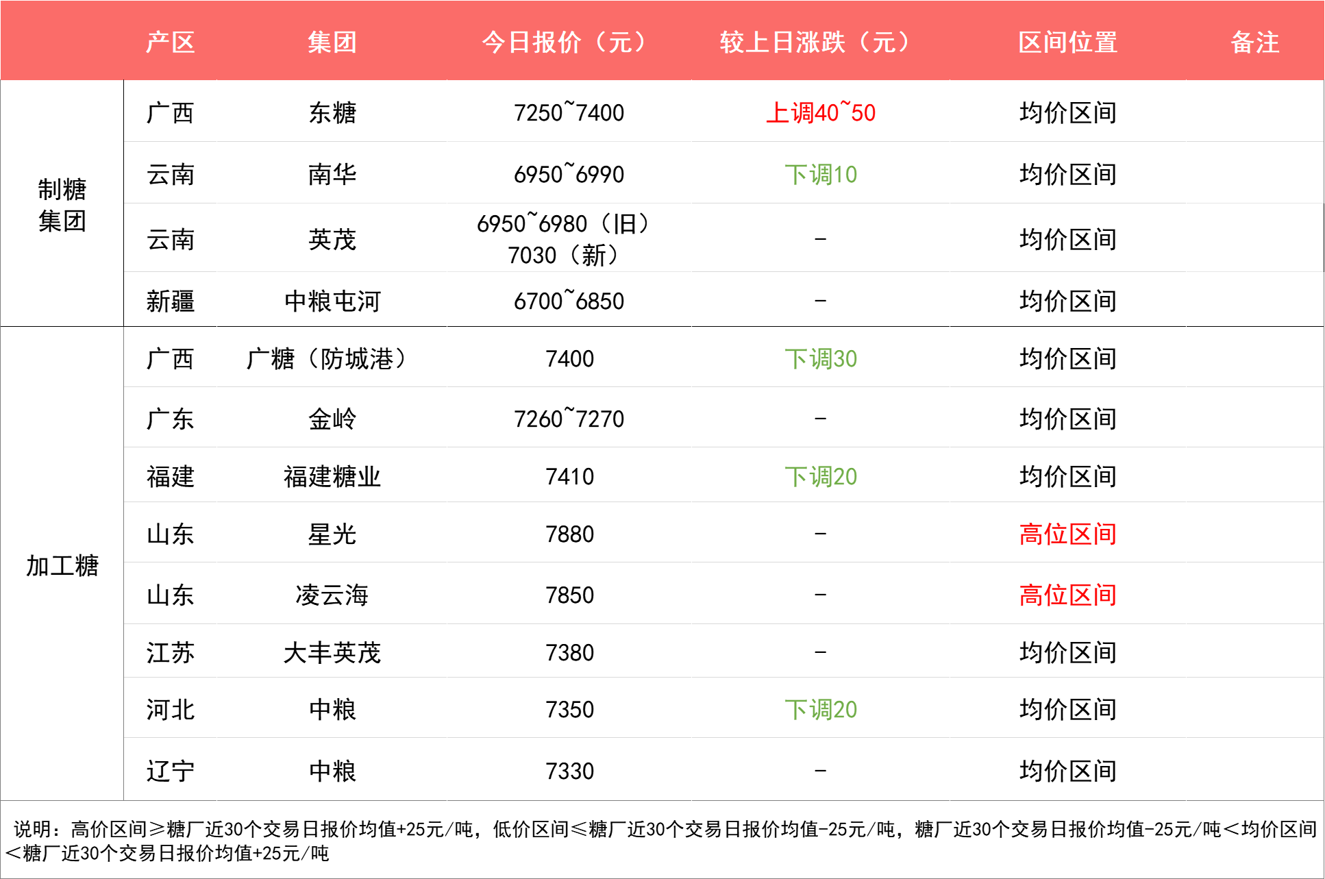 加工糖厂报价区间为7260~7410元/吨,其中河北中粮、辽宁中粮下调20元/吨,广糖(防城港)下调30元/吨。