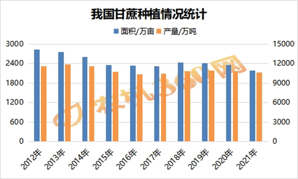 近十多年的统计数据显示,我国甘蔗年种植面积在2000到3000万亩之间波动,2012年种植面积最大,超过了2830万亩。在国内外食糖价格倒挂的影响下,国内甘蔗种植面积,有缩小趋势。我国甘蔗年产量在1.0~1.2亿吨之间波动,2013年产量最高,超过了1.19亿吨。这十多年间,随着甘蔗种植技术的不断提升、推广,我国甘蔗单产水平提高了近20%,从2013年每亩4.55吨提高到了2021年每亩5.4吨水平。