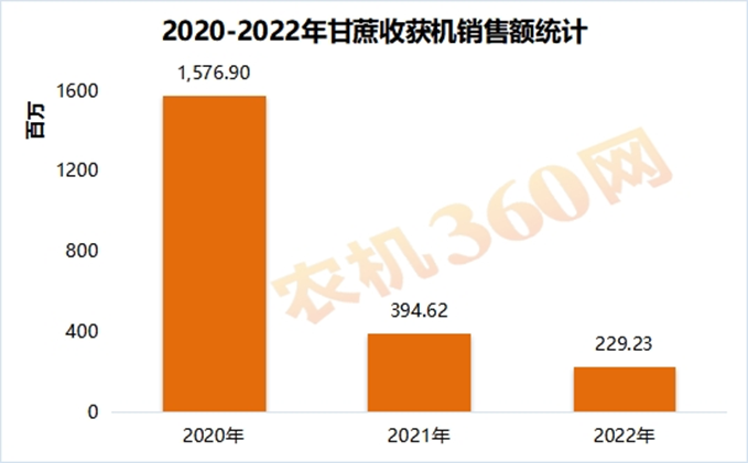 甘蔗收获机的销售额与销量变化趋势相似,也在逐年减少。2022年实现销售额2.29亿元,较2021年下滑了41.91%,更是不足2020销售额的20%。
