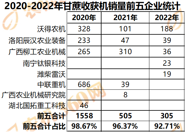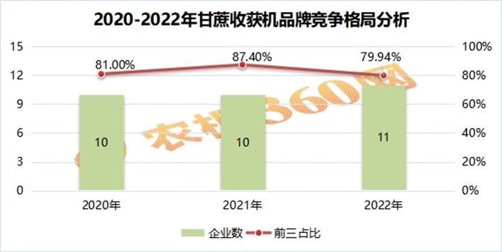 从甘蔗收获机销量前三品牌集中度变化来看,品牌集中度已较高。2022年,前三品牌占比为79.94%,前五品牌合计市场占比为92.71%。由此可见,甘蔗收获机市场份额主要集中在前三企业中。