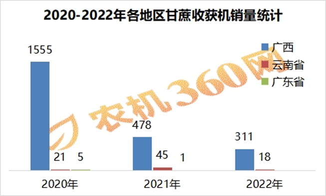 从最近三年甘蔗收获机的地区销售分布来看,主要集中在广西地区,云南与广东也有少量销售。广西地区占了90%多的市场份额,云南占了5%左右的市场份额。甘蔗收获机销量的这种分布,与甘蔗种植面积分布是直接相关的,广西的甘蔗种植面积为1300万亩左右,占了全国甘蔗种植面积的近六成。