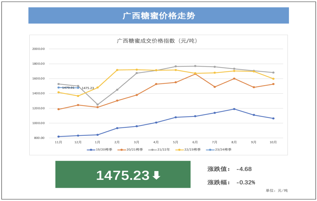 截至12月底,泛糖科技副产品销售平台的广西糖蜜成交价区间为1430~1500元/吨,加权均价为1475元/吨,环比上月下跌4.68元/吨,价格走势稳定。