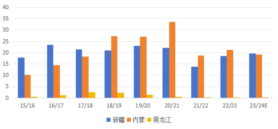 图:2015/16-2023/24榨季主要省区甜菜糖蜜产量情况(单位: 万吨)