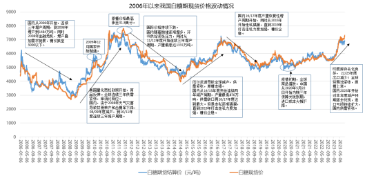 复盘历史白糖价格,拉长时间看,增减产周期主导糖价长周期走势。06年至今历史上三次上涨,共同特点都是连续两至三年的连续减产,两次下跌,主要原因都是产量恢复性增加。所以,从产量周期看,2024年将是白糖熊市周期的开始。