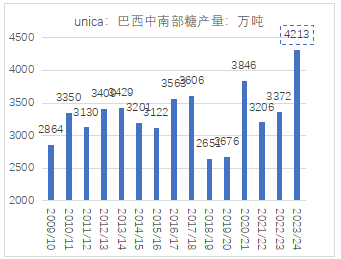 23/24年度的巴西中南部糖产量达到了创纪录的高位,一方面因为23年底降雨情况特别好,甘蔗产量创历史新高,压榨量同比增18.95%;另一方面制糖收益较乙醇具备明显优势,糖厂最大化制糖,制糖比位49.04%,去年45.95%,所以截至1月底中南部糖产量达到了4213万吨,同比增25.52%。目前是24/25年度甘蔗生长期,天气降雨对下年度产量影响大,因12-1月降雨同比减少,所以市场机构调低了下年度糖产量,其中巴西甘蔗种植户协会预计2024/25榨季巴西中南部甘蔗入榨量将会降至6.2亿吨左右,同比下降约4.6%。虽然产量因为降雨不及去年有所下降,但预计也将维持在第二纪录高位。加上今年结转库存预计比去年高出200万吨(因为出口增幅可能不及产量增幅),相当于下年度巴西供给并不比本年度少。