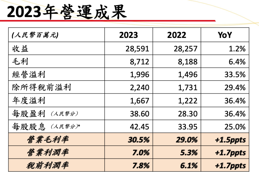 3月6日,统一企业中国控股有限公司发布2023年业绩。财报显示,2023年收益285.91亿元,同比增长1.2%;净利润为16.67亿元,同比增长36.4%。与此同时,2023年公司毛利率增长1.5%至30.5%。