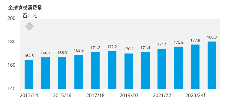 我们认为,2023/24年度全球将消费1.778亿吨糖,比上一年增长1.1%。这意味着糖的消费量与世界人口的增长一致,而人均糖摄入量却没有增长。